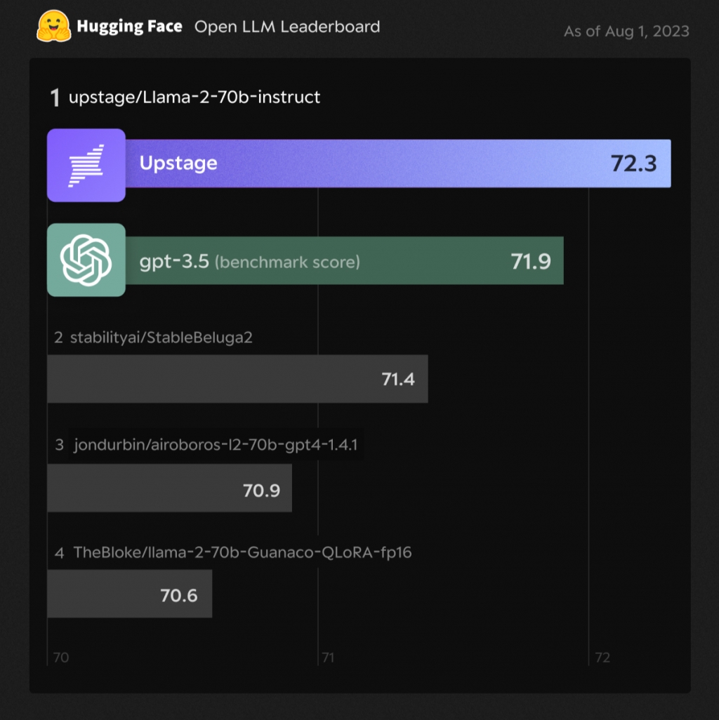 머신러닝 플랫폼 허깅페이스에서 운영하는 '오픈 LLM(거대언어모델) 리더보드'에서 업스테이지가 신규 개발한 70B(700억개)규모 매개변수의 생성AI 모델은 72.3점을 기록했다. 챗GPT의 기반모델인 GPT-3.5(71.9점)보다 높은 점수다.