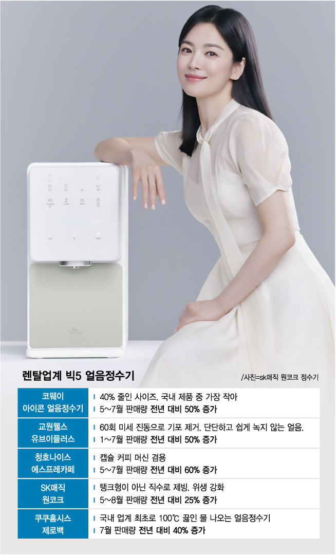 23일 가전업계에 따르면 코웨이와 청호나이스의 올해 5~7월 얼음정수기 매출이 전년 동기보다 각각 50%, 60%씩 늘었다. SK매직은 5~8월 매출이 25%, 쿠쿠홈시스는 7월 매출이 40% 증가했고 교원웰스는 1~7월 매출이 50% 늘었다. 예년까지는 5월즈음 날이 더워져야 판매가 늘었는데, 이제는 봄, 가을, 심지어 겨울에도 판매가 적지 않다는 게 업계 설명이다.