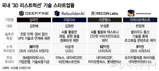 3D 리컨스트럭션 기술에 생성 AI(인공지능) 기술을 접목하는 스타트업들도 있다. 주변 사물을 디지털 트윈으로 제작하는데 특화된 리빌더AI와 리콘랩스가 대표적이다.