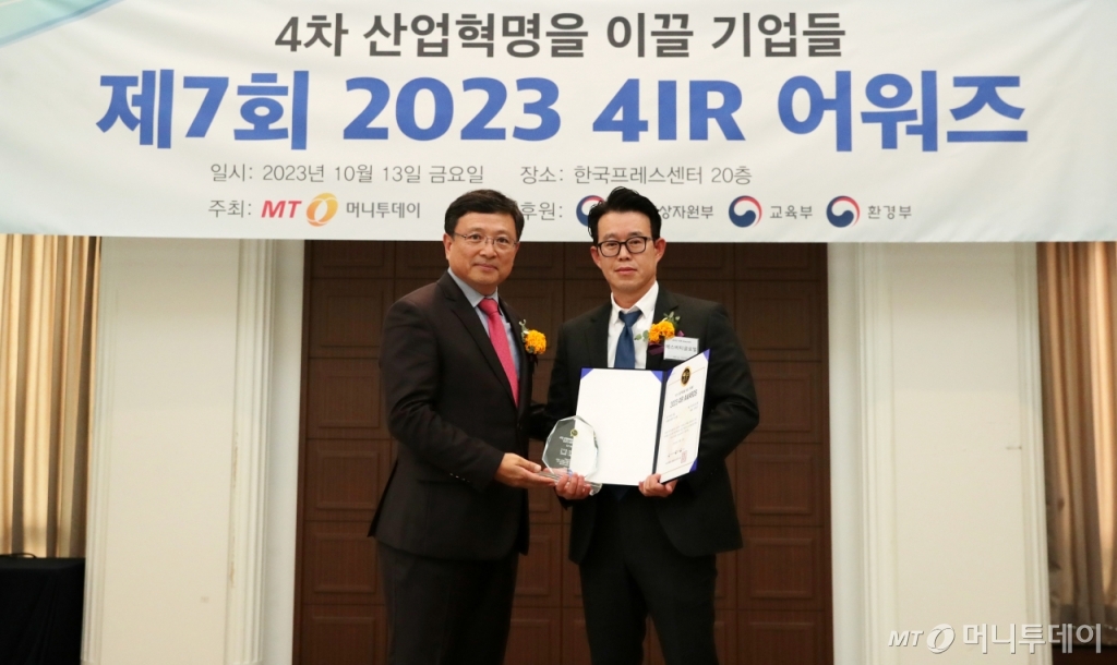 권영근 에스비티글로벌 전무(사진 오른쪽)가 13일 오후 서울 중구 한국프레스센터에서 열린 머니투데이 주최의 '2023 제7회 4IR 어워즈'(4th Industrial Revolution Awards)에서 '차세대 ERP 시스템'으로 'ICT 부문 대상'을 수상하고 이종섭 동국대학교 교수와 기념사진을 찍고 있다.