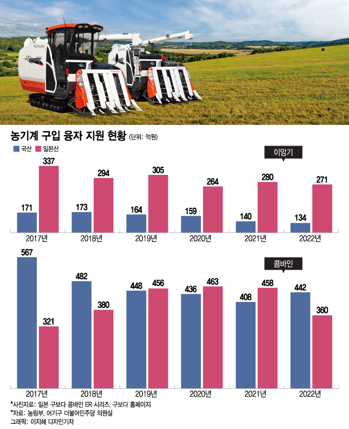 실제로 일본 기업이 진출한 '쌀농사 기계'는 일본산 구매에 쓰인 예산이 국산보다 대체로 더 많다. 콤바인은 2019년부터 일본산 구매에 지원된 예산이 국내산에 쓰인 예산을 앞질렀다. 지난해는 다시 뒤집혔지만 그전 3년 동안 적게는 8억, 많게는 50억원 가까이 일본산 구매에 더 많이 쓰였다. 이앙기는 불균형이 더 심하다. 최근 5년 동안 일본산 구매에 예산이 최소 2배 넘게 더 쓰였다. 2017~2022년 동안 국산 구매에는 한해 134억~173억원, 일본산에는 264억~337억원이 쓰였다.