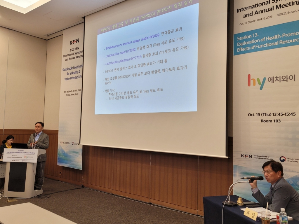 hy가 이번 정기학술대회에서 발표한 연구는 국내대학 4곳 원광대, 한양대, 포항공대, 수원대와 공동 진행한 결과다. hy와 연구진은 동물실험을 통해 자사 특허 프로바이오틱스 'MPRO3'의 장내 미생물 환경 변화와 과민면역반응 억제효과를 확인했다. 또 개별인정형원료인 '꾸지뽕잎 추출물'의 '헬리코박터 파이로리균' 제균 효과 및 감염에 대한 염증 수치 감소를 밝혀냈다.