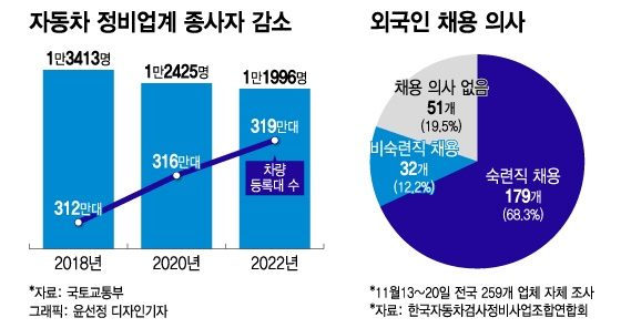 자동차 정비업계는 E-7 비자 외국인 고용을 허가해달라고 2010년대 초부터 요구해왔다. 국토교통부 통계에 따르면 정비업 종사자는 2018년 1만3413명에서 지난해 1만1996명으로 10.6% 줄었다. 같은 기간에 전국 차량 대수는 312만대에서 319만대로 늘었다.