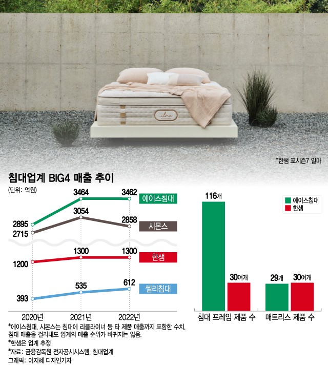 제품이 적은 것도 아니다. 현재 판매하는 매트리스 제품 수는 한샘이 30여개, 에이스침대가 29개로 비슷하다. 하지만 '침대는 에이스, 시몬스'라는 아성을 넘지 못하는 것으로 풀이된다. 지난해 매출이 에이스침대는 3462억원, 시몬스는 2858억원, 한샘은 종합 가구 회사라 따로 침대 매출만 발표하지 않았지만 업계는 1200억~1300억원이라고 추정한다. 에이스침대와 시몬스는 침대 말고도 리클라이너 소파 등 다른 제품들 매출이 포함된 수치이기는 하지만, 침대 매출만 걸러내더라도 침대 업계의 매출 순위가 바뀌지는 않는다.