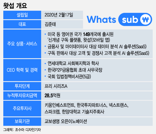 왓섭은 이뿐 아니라 공과금, 통신비, 대출 이자 등 사용자의 정기 지출 내역을 찾아 결제 전 사용자에게 '2개의 지출내역이 2일 뒤 결제된다'는 식으로 안내하고 관리할 수 있는 기능도 제공한다. 김 대표는 "왓섭 AI(인공지능)가 시중에 1472개 정기결제 상품을 분석하고 소비자에게 '이렇게 지출이 되고 있다'며 사용자에 지출 정보를 알려 합리적 소비를 유도한다"고 말했다.