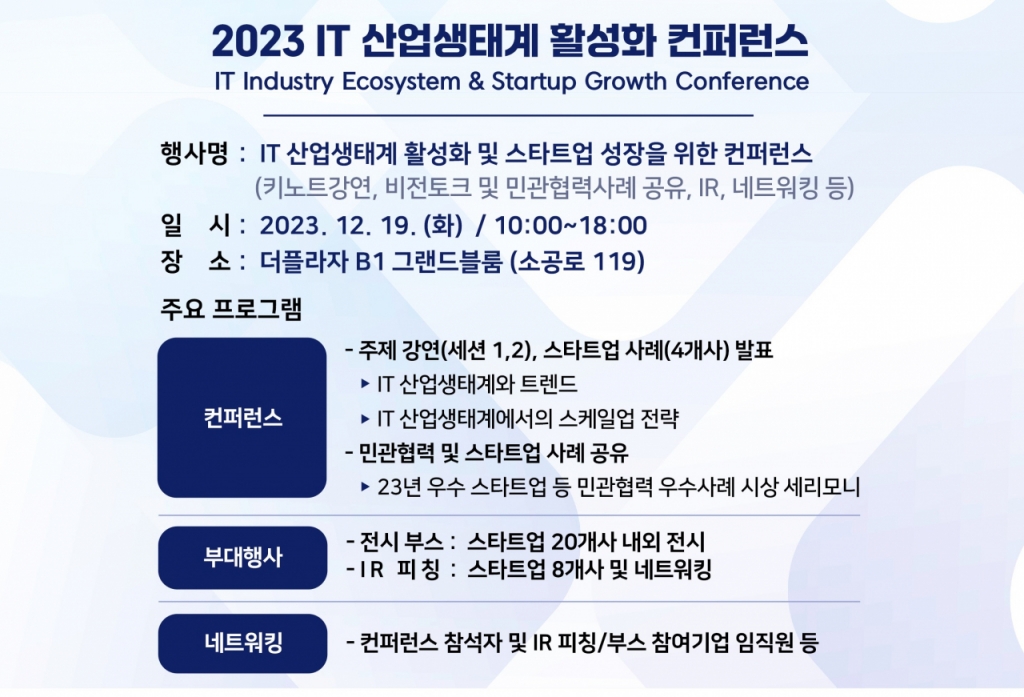서울경제진흥원(SBA)은 오는 19일 서울 중구 더플라자에서 '2023 IT 산업 생태계 활성화 컨퍼런스'를 연다고 18일 밝혔다. 주제강연과 스타트업 민관협력 사례 등이 발표되고 스타트업들의 부스도 운영된다.