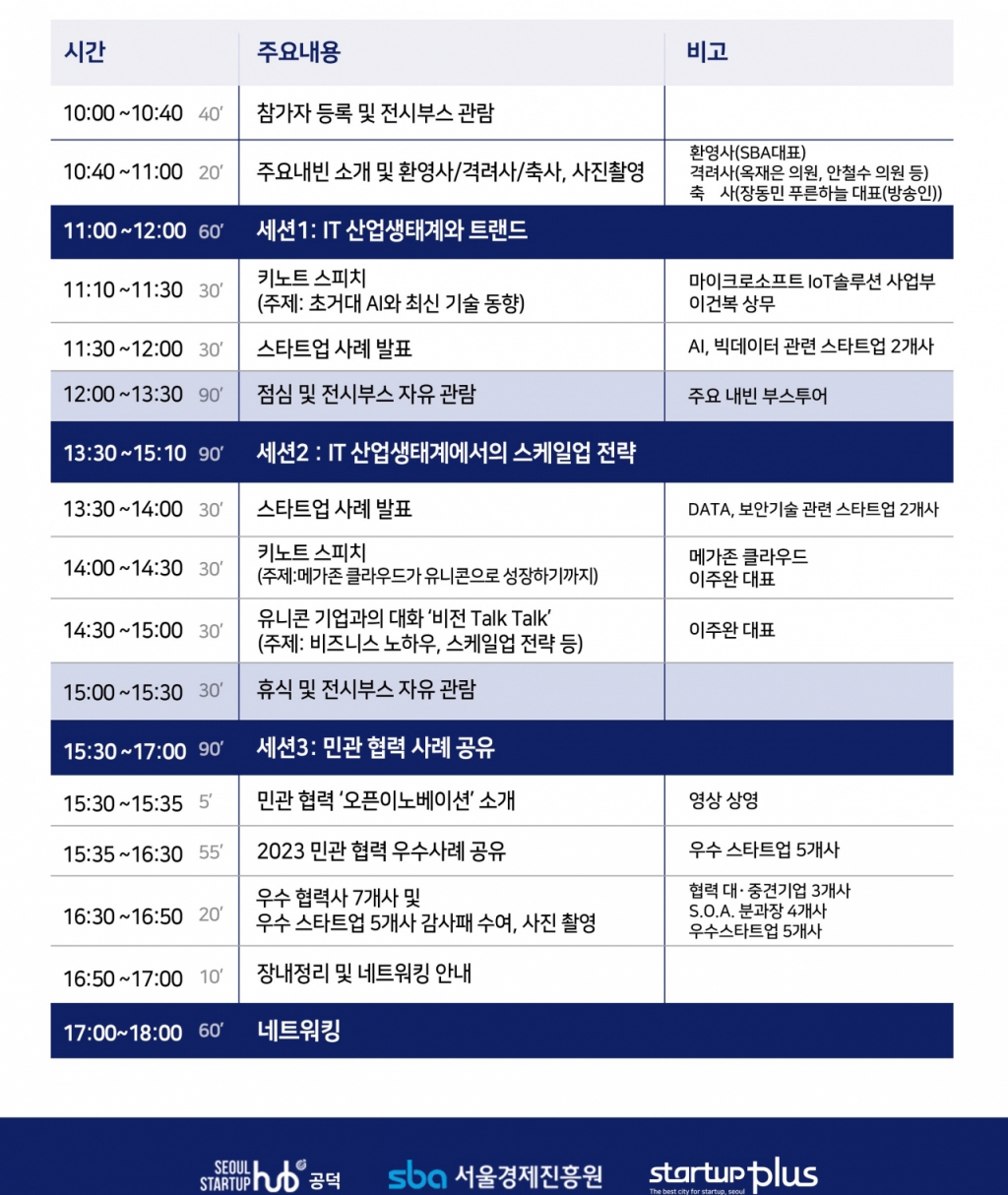 SBA 관계자는 "IT 산업생태계 관련 스피치와 스타트업들의 피칭, 서울시 오픈이노베이션 성과공유회가 열리고 스타트업 부스가 운영될 것"이라며 "많은 참여를 바란다"고 밝혔다.