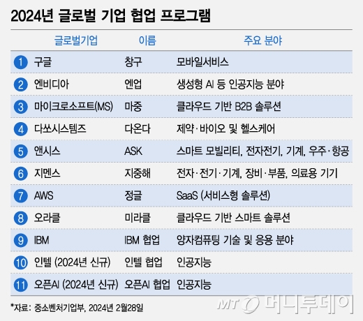 지난해 구글플레이 외에도 △엔비디아 △마이크로소프트(MS) △다쏘시스템 △앤시스코리아 △지멘스 △아마존웹서비스(AWS) △오라클 △IBM 등 9개사가 진행했다. 엔비디아는 '엔업', MS는 '마중' 등 각 사 명칭을 따서 프로그램을 구성했다. 올해는 인텔, 오픈AI가 합류해 총 11개 기업이 됐다. 모집대상도 지난해보다 35개사 늘려 총 305개사를 선정한다.