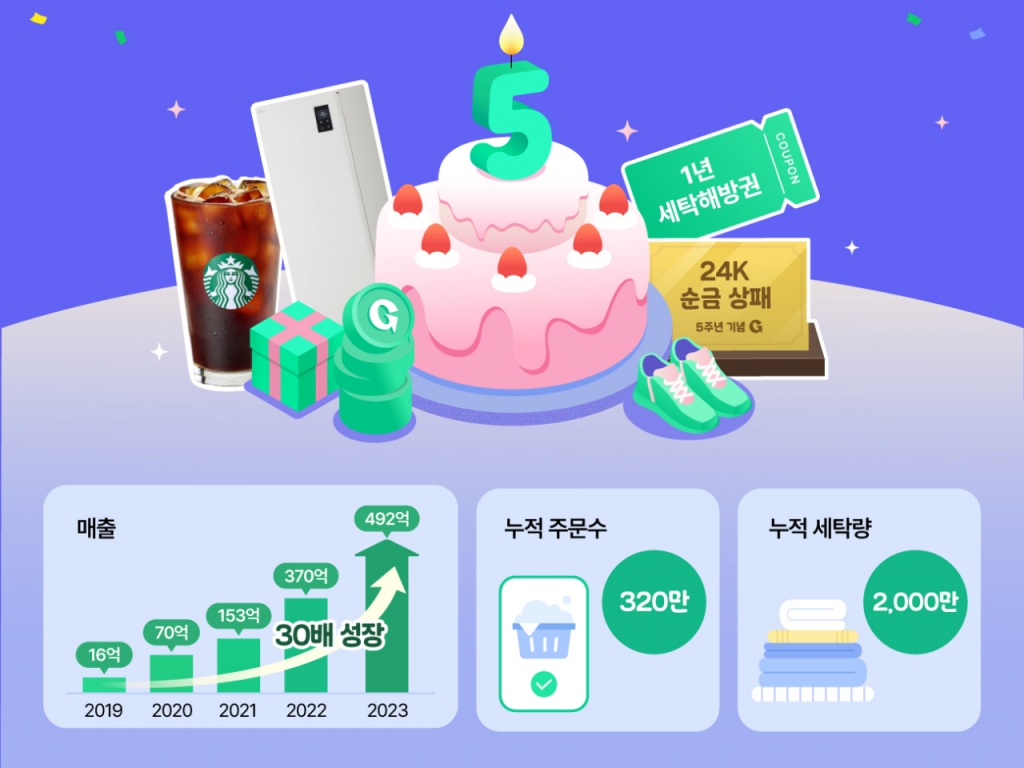 매출액은 2019년 16억원, 2020년 70억원, 2021년 153억원, 2022년 370억원, 지난해 492억원으로 최근 5년간 30배 이상 성장했다. 특히 서울·경기·부산 등 4개의 스마트팩토리를 거점으로 전국적 서비스로 확장하면서 1일 세탁 주문 건수가 5000가구를 돌파했다.