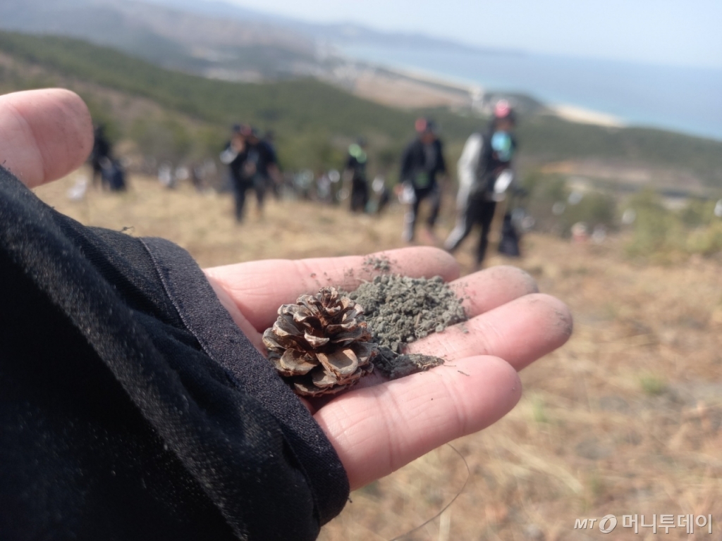 이날 신혼부부 120여쌍은 전세버스를 타고 봉화대산 근처 도로에 내려 15분쯤 산길을 올라 식재지로 향했다. 산불에 탄 곳이라 제대로 된 등산로가 없어 부부들은 나무나 돌 계단 없이 경사진 땅을 올랐다. 땅은 언젠가 화산이라도 터진 듯 재가 섞여 있었다. 땅 색깔이 아스팔트처럼 새카맣고, 이틀 전 내린 비와 섞여 질퍽한 곳도 있었다. 등산로는 전혀 정비되지 않아 땅의 군데군데 주먹만 한 돌이 위태롭게 박혀 있었다. 부부들이 땅에서 발을 떼면 돌과 자갈이 흘러내렸고, 어떤 참가자는 발이 미끄러졌다. 하지만 부부들은 목장갑 낀 손을 마주잡고, 길이 좁아져 한줄을 이뤄야하는 구간은 뒷 사람이 앞 사람의 허리를 밀어주며 산을 꿋꿋이 올랐다.