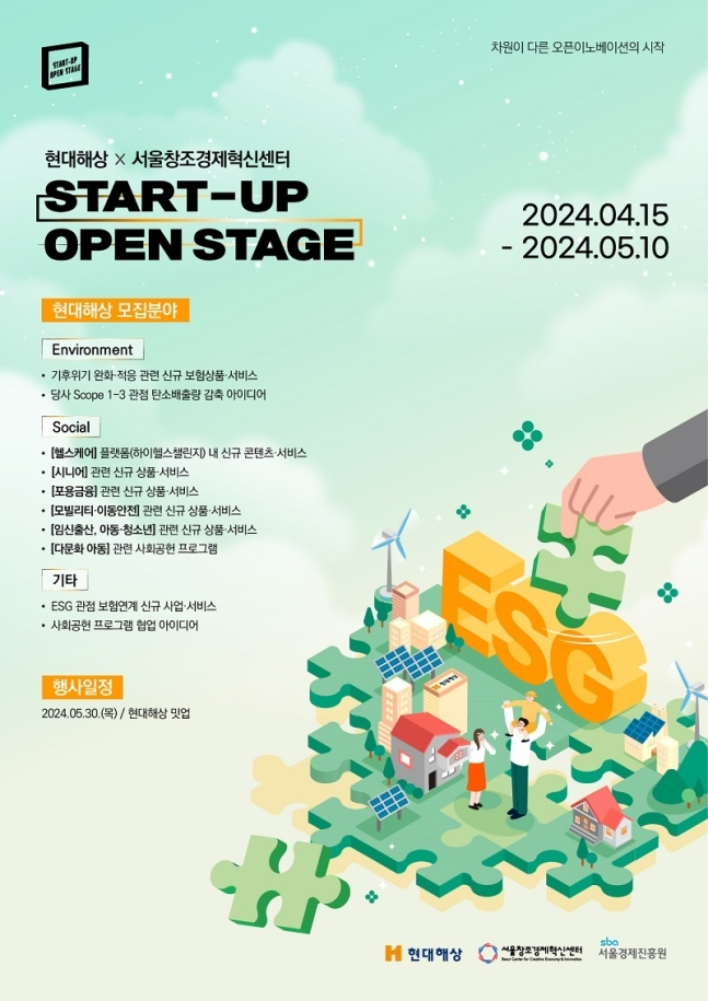 현대해상(30,000원 ▼1,450 -4.61%)은 서울창조경제혁신센터(이하 서울혁신센터)와 함께 ESG(환경·사회·지배구조) 스타트업 발굴을 위해 '2024년 스타트업 오픈스테이지' 참여 기업을 모집한다고 15일 밝혔다.