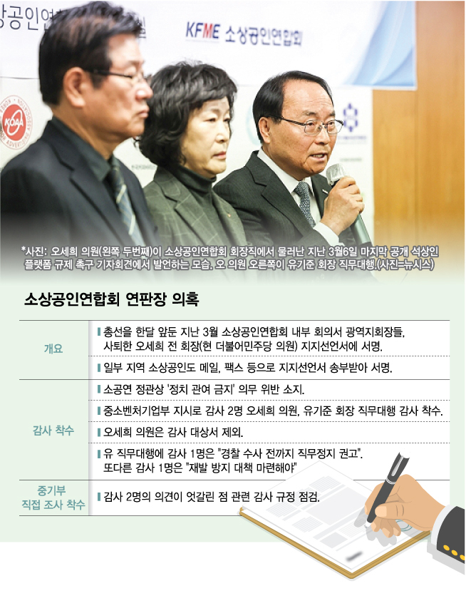 중소벤처기업부는 오는 26일 소공연의 현장 조사에 착수한다고 22일 밝혔다. 중기부 관계자는 오세희 전 소공연 회장(현 더불어민주당 의원)이 국회에 입성하는 과정에 불거진 연판장 의혹으로 소공연이 자체 감사에 착수한 결과 내부 감사 2명 중 1명이 "이런 일이 되풀이되지 않도록 규정의 개정 등 제도적 장치를 마련해야 한다"고 의견을 낸 점을 거론하며 "정관과 내부 규정의 개정 필요성이 있다고 보고 조사에 착수한다"고 말했다.
