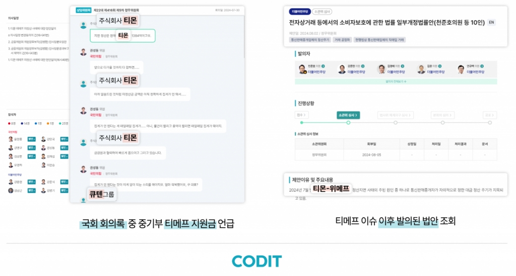 이를 통해 이커머스, PG사 등 티메프 사태 관련 피해기업들은 필요한 입법·정책 정보를 빠르고 정확하게 파악할 수 있다는 설명이다. 코딧은 국회와 정부의 정책 데이터를 분석해 기업의 리스크 관리에 기여해 왔다.