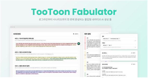 투툰-패불레이터는 △웹툰 세계관 설정 △시놉시스 생성 △트리트먼트 생성 △시나리오 생성 △캐릭터 이미지 생성 △스토리 기획서 등 웹툰 제작 단계별로 서비스를 제공한다. 현재 데모버전으로 출시된 투툰-패불레이터는 로그인 후 무료로 사용 가능하다.