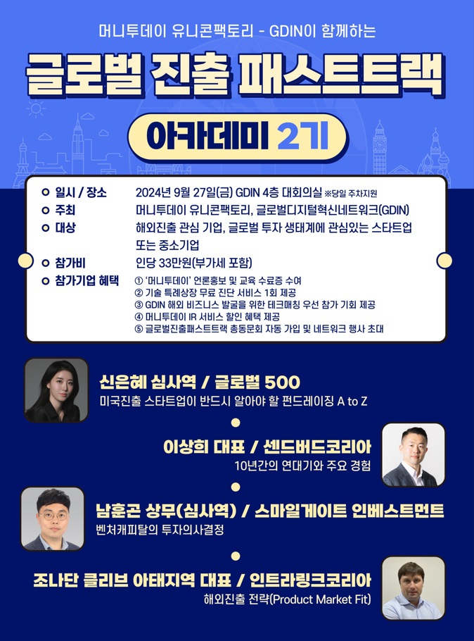 GDIN(글로벌디지털혁신네트워크)와 머니투데이 스타트업 미디어 플랫폼 유니콘팩토리가 '글로벌 진출 패스트트랙' 아카데미 2기를 내달 27일 경기도 성남시 GDIN 4층 대회의실에서 개최한다.