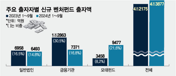 국내 벤처투자 생태계의 모태펀드 의존도가 더욱 높아진 것으로 나타났다. 올해 1~9월 신규 결성펀드 출자금 중 모태펀드가 차지하는 비중이 지난해 같은 기간보다 3배 가까이 늘어난 것. 반면 2022~2023년 주요 출자자(LP)였던 금융기관과 일반법인의 출자는 절반 가까이 줄었다.