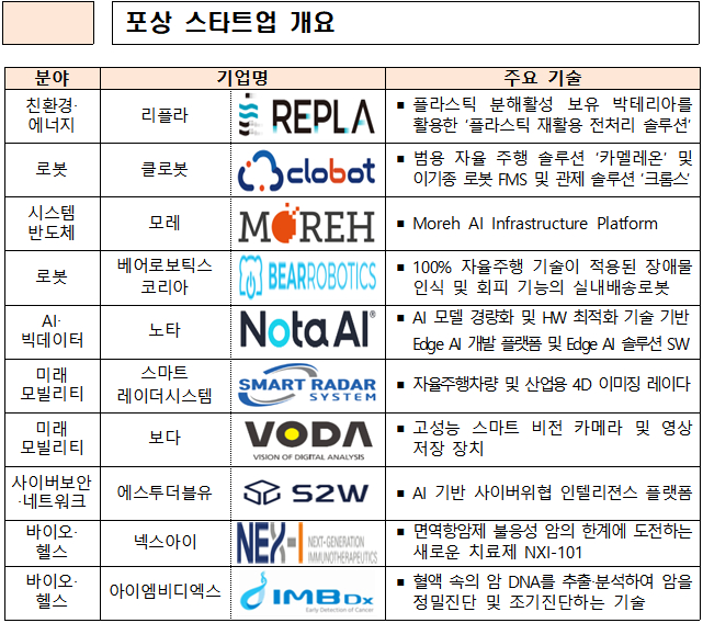 행사 첫날은 우수 스타트업 10개사와 이들의 성장을 지원한 LG전자(105,600원 ▼2,700 -2.49%), 삼성전자(167,200원 ▼9,100 -5.16%), SK키파운드리, DB하이텍 등 대기업 4개사, 창업진흥원 등 전문기관 유공자 6명에 대한 포상이 진행됐다. 포상한 스타트업은 △리플라 △클로봇(48,350원 ▼600 -1.23%) △모레 △베어로보틱스코리아 △노타 △스마트레이더시스템 △보다 △에스투더블유 △넥스아이 △아이엠비디엑스 등 10개사다.