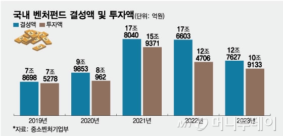 그러나 같은 기간 벤처투자액은 47조4172억원에 그쳤다. 글로벌 고금리와 지정학적 불확실성 여파다. 벤처펀드 결성액에서 투자액을 뺀 10조원이 넘는 자금이 드라이파우더(미소진 투자금)로 남았다.
