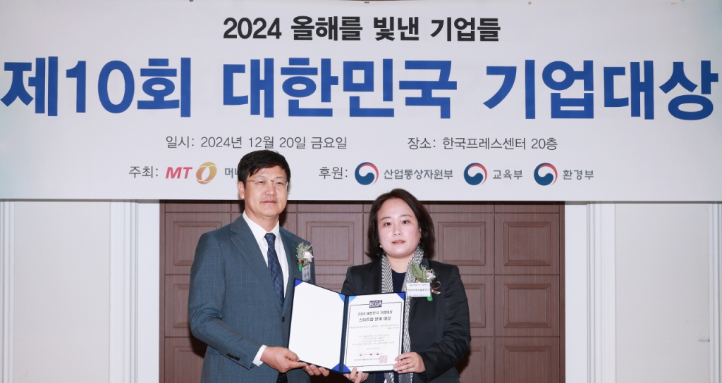 이나현 하온바이오솔루션스 대표(사진 오른쪽)가 20일 오후 서울 중구 한국프레스센터에서 열린 머니투데이 주최의 '2024 제10회 대한민국 기업대상' 시상식에서 '비임상 CRO 결과 관리 프로그램' 부문 '스타트업' 분야 대상을 수상하고 송기용 머니투데이 전무와 기념사진을 촬영하고 있다.
