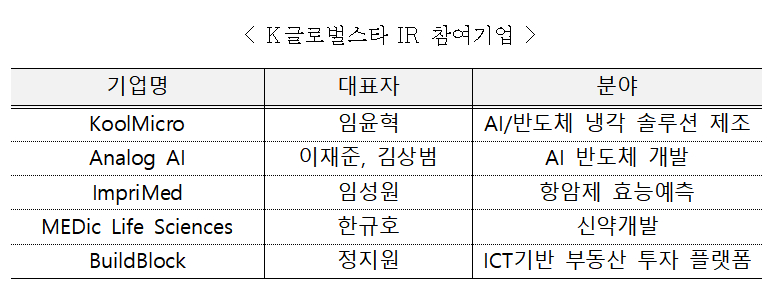 행사는 스타트업 투자유치 IR, 네트워킹 오찬·만찬, 주요 연사 강연, 글로벌시장 진출 전략 설명회 등으로 진행됐다. 행사 첫날에는 한국 스타트업의 투자유치 IR이 개최됐다. 중기부의 글로벌 투자유치 플랫폼 'K-글로벌 스타'에서 선발한 5개 스타트업이 참여했다.