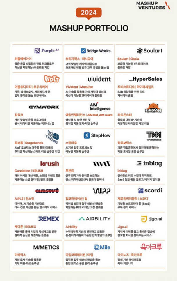 매쉬업벤처스가 투자한 기업의 누적 후속 투자유치 금액은 약 2조4000억원이다. 특히, 지난해 AI 버추얼 프로덕션 플랫폼 '비블'과 생성형 AI 웹툰 제작기업인 '라이언로켓'이 미국 딥테크 전문 투자사로부터 해외 투자유치에 성공하는 등 글로벌 성과가 돋보였다.