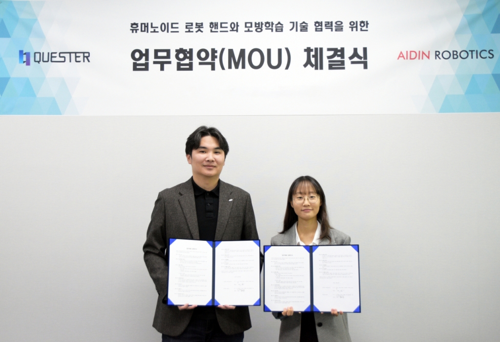 로봇 센서 스타트업 에이딘로보틱스가 핸드 트래킹 솔루션 스타트업 퀘스터와 '휴머노이드 로봇핸드'와 모방학습 기술 개발을 위한 업무협약(MOU)을 체결했다고 22일 밝혔다.