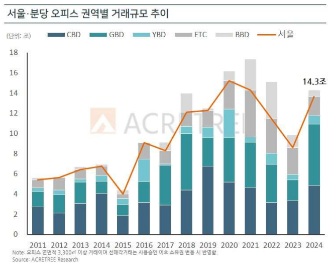 상업용 부동산 컨설팅 업체 에이커트리는 3일 '2024년 4분기 오피스 시장 보고서'를 발표했다. 보고서에 따르면 2024년 4분기 서울·분당 상업용 부동산 거래 규모는 약 5조62억원을 기록했다. 2024년 연간 총 거래액은 약 14조3000억원으로 2022년(15조1000억원) 수준을 회복했다. 2023년 연간 약 9조8000억원과 비교해 45% 늘었다.