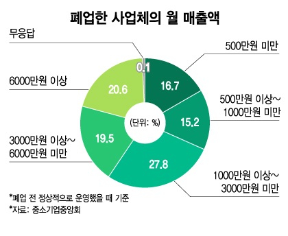 조사 대상 중 월 평균 매출액이 500만원 미만이라고 답한 비율은 16.7%, '500만원 이상~1000만원 미만'은 15.2%, '1000만원 이상~3000만원 미만'은 27.8%로 나타났다. 월 평균 매출액이 '3000만원 이상~6000만원 미만'은 19.5%, 6000만원 이상은 20.6%로 조사됐다. 월 평균 매출액은 도·소매업과 제조업이 높게 나왔다. 숙박·음식점업과 서비스업이 낮게 나와 업종별로 큰 차이를 보였다.