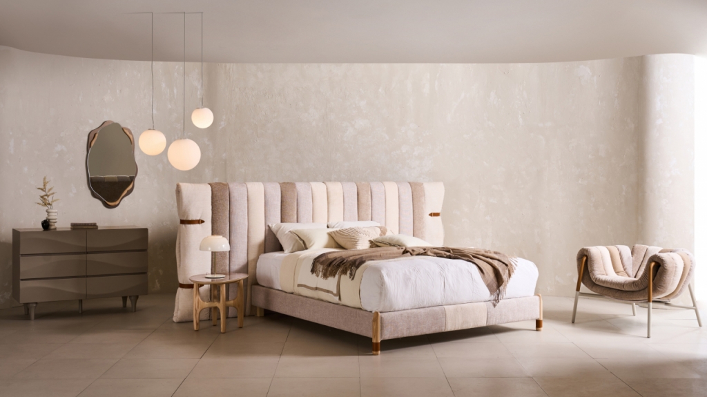 버밀리온 침대는 헤드보드에 색상과 텍스처가 갈색, 연분홍, 베이지 등 각각 다른 3종의 패브릭을 레이어드(층층이 겹쳐 있는 형태)로 적용해 독창적인 디자인을 구현했다. 햇빛에 비친 주홍빛 버밀리온 절벽이 물결치듯 다른 색을 내는 느낌을 준다.