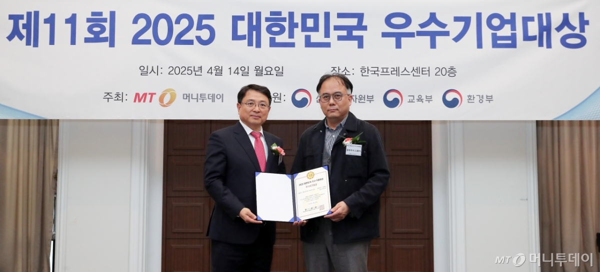박성식 클라우드스퀘어 대표(사진 오른쪽)가 14일 오후 서울 중구 한국프레스센터에서 열린 머니투데이 주최의 '2025 제11회 대한민국 우수기업대상' 시상식에서 '클라우드 매니지먼트 서비스' 부문 '우수ICT대상'을 수상하고 이종섭 동국대학교 교수와 기념사진을 촬영 중이다.