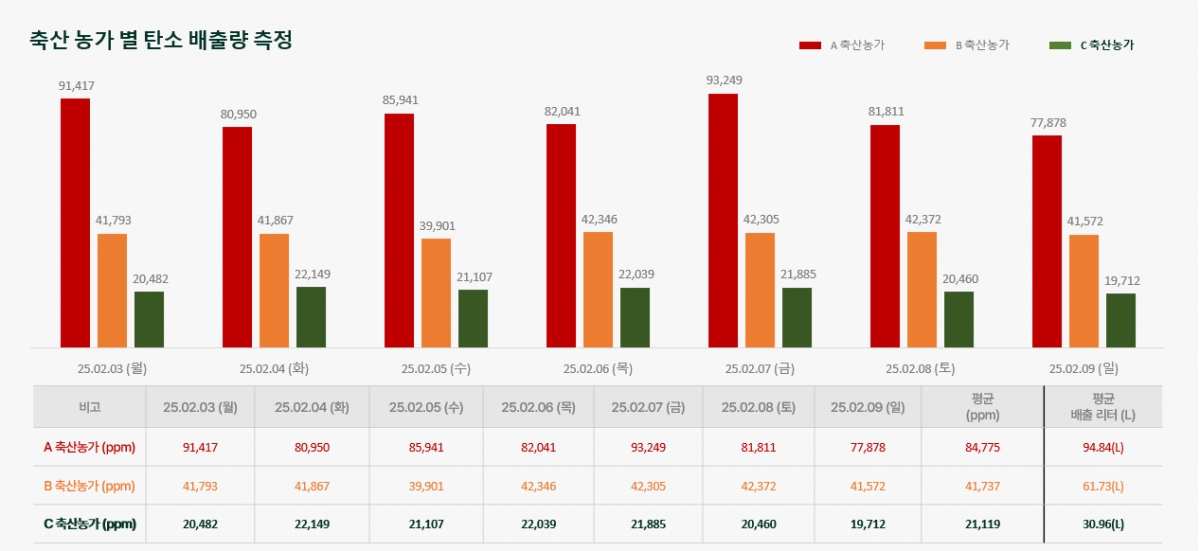 이번 측정은 강원도와 전라남도 세 곳의 축산농가를 대상으로 진행됐다. 측정에 따르면 A농장(비육소), B농장(번식우), C농장(저탄소 축우)의 평균 메탄 배출량은 각각 94.84 리터, 61.73 리터, 30.96 리터로 나타났다. 농가의 대기 중 메탄 농도는 각각 8만4755ppm, 4만1737ppm, 저탄소 축우는 2만1119ppm이었다.