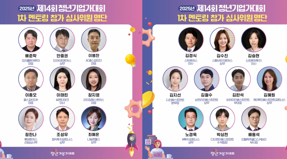 1차 멘토링에 참여하는 심사위원은 △김경식 스틱벤처스 이사 △김수진 스톤브릿지벤처스 상무 △김승현 신한벤처투자 이사 △김지선 CJ인베스트먼트 본부장 △김철수 삼천리인베스트먼트 상무 △김판석 비하이인베스트먼트 부대표 △김혜원 케이투인베스트먼트파트너스 상무 △노경욱 iM투자파트너스 상무 △박상천 디티앤인베스트먼트 수석팀장 △배동석 인텔렉추얼디스커버리 부사장 △배준학 오라클벤처투자 대표 △안중걸 인라이트벤처스 상무 △이병찬 AC패스파인더 대표 △이종오 패스파인더H 대표 △이태린 씨엔티테크 이사 △장지영 라이징에스벤처스 대표 △정한나 롯데벤처스 선임심사역 △조성우 원익투자파트너스 상무 △최예은 나눔엔젤스 상무 등 총 19명이다.