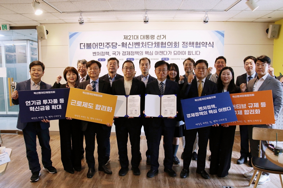 이에 더불어민주당은 핵심 정책과제로 △벤처정책을 경제정책의 핵심 아젠다로 설정 △연기금 투자풀 활용 등 혁신금융 확대 방안 마련 △벤처기업 혁신성장을 위한 근로제도 합리화 △신산업 발굴과 혁신의 기회 확장을 위한 규제 합리화 등을 제21대 대선의 핵심 과제로 선정하고 혁단협과 협약을 체결했다.