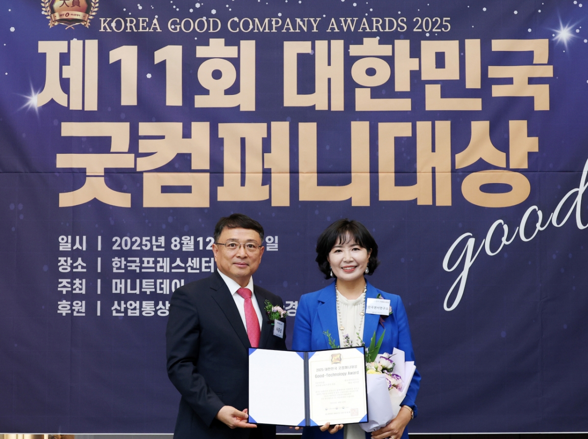 이수민 한국센서연구소 대표(사진 오른쪽)가 12일 오후 서울 중구 한국프레스센터에서 열린 머니투데이 주최의 '2025 제11회 대한민국 굿컴퍼니대상' 시상식에서 '7년 연속상'으로 '저주파 노이즈 분석' 부문 'Good-Technology Award'(굿-기술대상)를 수상하고 이종섭 동국대학교 교수와 기념사진을 촬영 중이다.