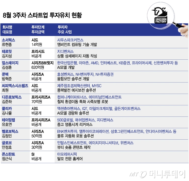 8월 셋째주(18~22일)에는 소서릭스, 테르밋, 업스테이지, 쿤텍, 씨피엑스시스템즈, 디든로보틱스, 클리카, 테이밍랩, 벰로보틱스, 글로브, 콘스탄트 등 11개 스타트업이 투자유치 소식을 전했다.