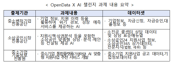 중소벤처기업부가 11월 6일부터 26일까지 공공기관이 출제한 과제를 AI(인공지능)를 활용해 해결하는 '오픈데이터 X AI챌린지'에 참가할 스타트업을 모집한다고 27일 밝혔다.