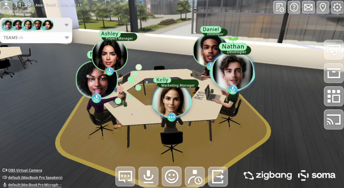 초기 줌이나 게더타운 등 기존 툴을 사용했으나, 오프라인 근무 환경에서처럼 직원들이 소속감과 유대감을 느낄 수 있는 새로운 솔루션이 필요하다고 판단해 소마를 자체 개발했다. 현재는 본사 없이 100% 원격근무 체제를 유지하며 오프라인 사무 공간을 온라인에 완벽히 구현한 혁신적인 업무 환경을 운영하고 있다.