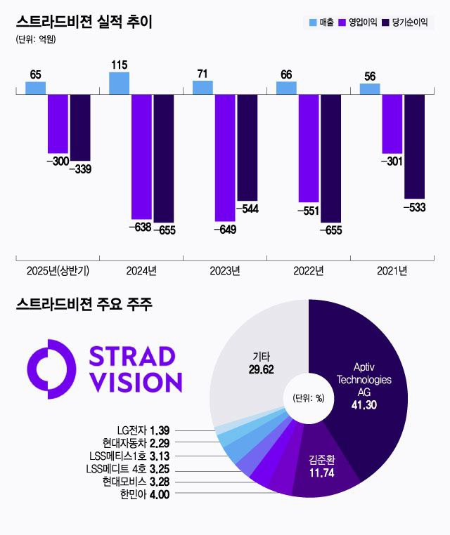 스트라드비젼의 최대주주는 2022년부터 2000억원을 넘게 단독 투자해 지분 약 41% 를 확보한 앱티브(Aptiv Technologies AG)다. 앱티브는 미국 나스닥 시장에 상장된 글로벌 기업으로 지난해 매출액은 197억달러(약 29조1847억원) 수준이다. 다만 앱티브가 대규모 투자를 하면서도 정작 M&A(인수·합병)을 진행하지 않고 지분투자에 그쳤다는 점을 고려하면 결국 해당 지분은 매물로 나올 가능성도 있다.