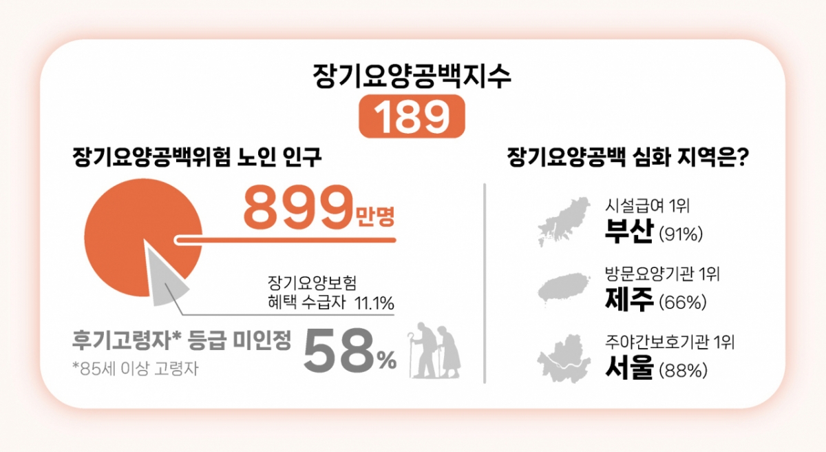 세부 지표도 전반적으로 악화됐다. 장기요양보험 혜택 수급 현황을 집계한 장기요양공백지수는 189를 기록했다. 보험 수급자는 약 113만명으로 2008년 대비 5배 증가했지만 노인 인구가 이를 상회하는 속도로 늘어 공백 규모가 커지고 있다는 분석이다.