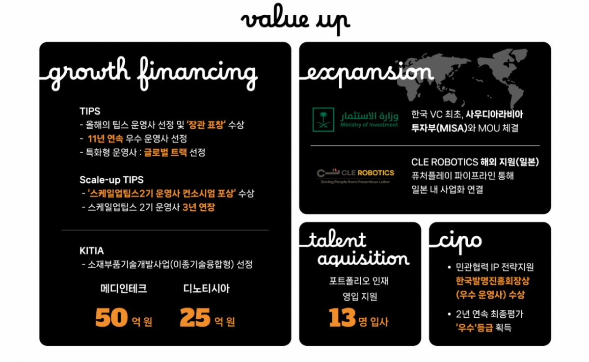 글로벌 분야에서는 사우디아라비아 투자부(MISA)와 업무협약을 체결하며 중동 진출 기반을 마련했다. 한국 VC 중 최초로 MISA와 협약을 체결한 사례로, 양국 스타트업·VC 생태계 협력을 본격화하는 상징적 의미가 크다는 설명이다.