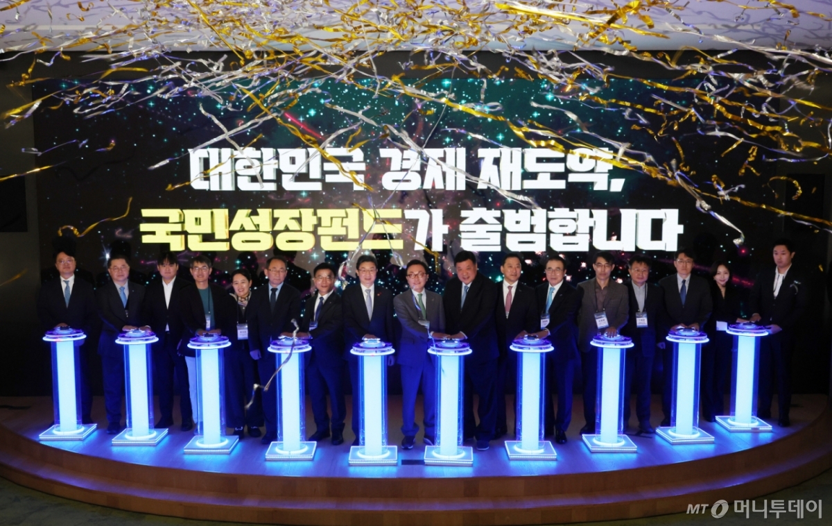 ![[서울=뉴시스] 배훈식 기자 = 박상진(왼쪽 일곱번째부터) 산업은행 회장, 이억원 금융위원장, 박현주 미래에셋 회장, 서정진 셀트리온 회장 등이 11일 오후 서울 영등포구 산업은행에서 열린 국민성장펀드 출범식에서 기념 세리머니를 하고 있다. 2025.12.11. dahora83@newsis.com /사진=배훈식](https://thumb.mt.co.kr/cdn-cgi/image/f=avif/21/2026/01/2026011516373853248_1.jpg)