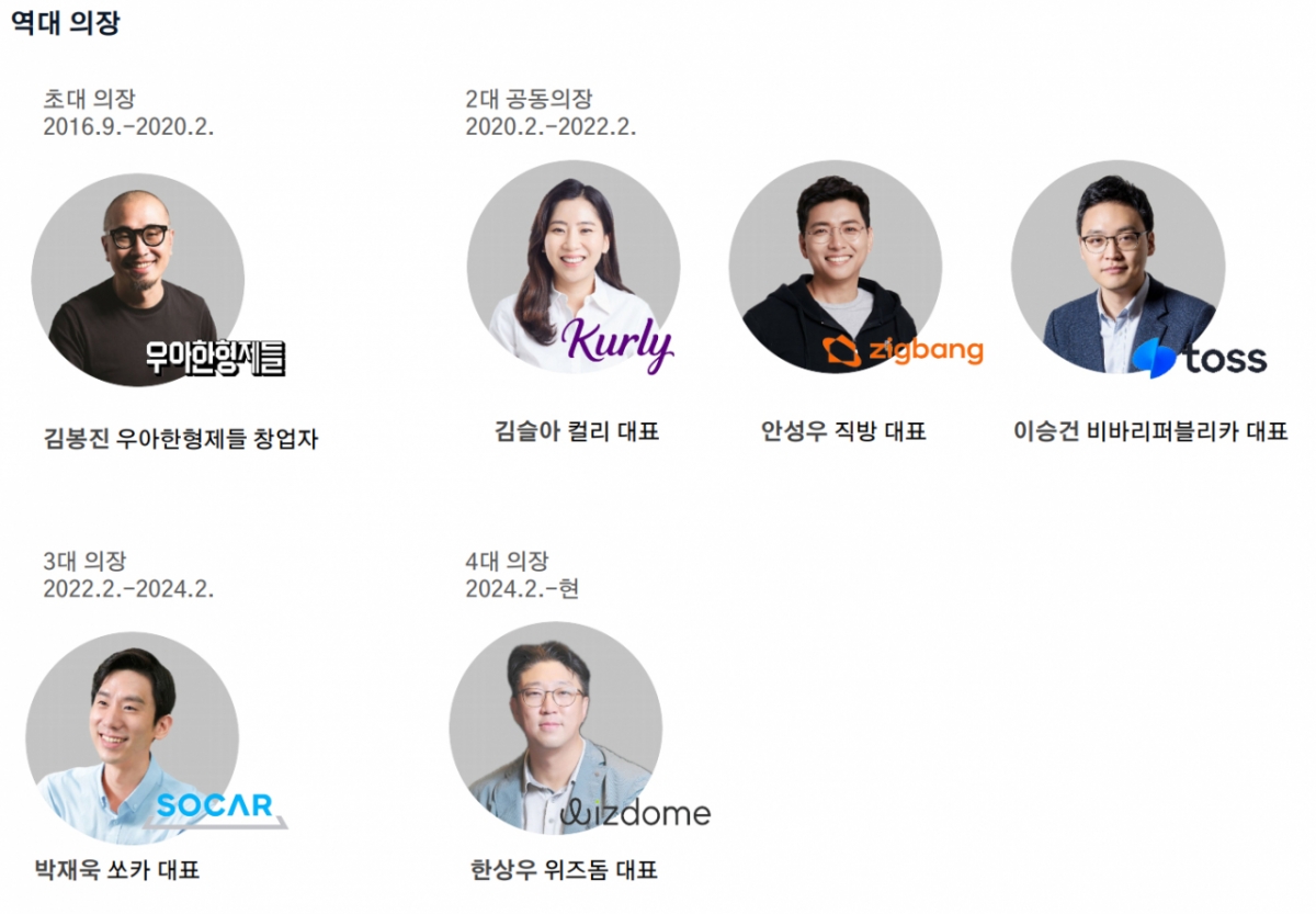1대 의장은 김봉진 우아한형제들(배달의민족) 의장, 2대 의장은 김슬아 컬리 대표, 안성우 직방 대표, 이승건 비바리퍼블리카(토스) 대표가 공동으로 맡았으며 3대 의장은 박재욱 쏘카(11,530원 ▲40 +0.35%) 대표가 역임했다. 한상우 의장은 2024년 2월 4대 의장에 취임해 임기를 시작했다.