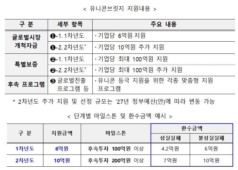중소벤처기업부가 2년간 16억원의 정부지원금과 최대 200억원의 특별보증을 제공하는 '유니콘 브릿지' 사업 참여기업을 모집한다고 30일 밝혔다. 마일스톤에 따른 지원·보증 환수조건이 있는 사업으로, 선정 후 100억원~300억원의 후속 투자를 유치하지 못하면 이에 따른 지원·보증도 환수된다.