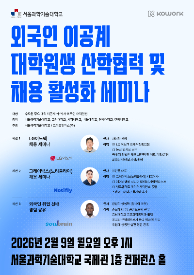 외국인 채용 플랫폼 코워크(KOWORK) 운영사 코워크위더스(대표 김진영)가 오는 9일 서울과학기술대학교와 함께 '외국인 이공계 대학원생 산학협력 및 채용 활성화'를 위한 세미나를 개최한다고 4일 밝혔다.
