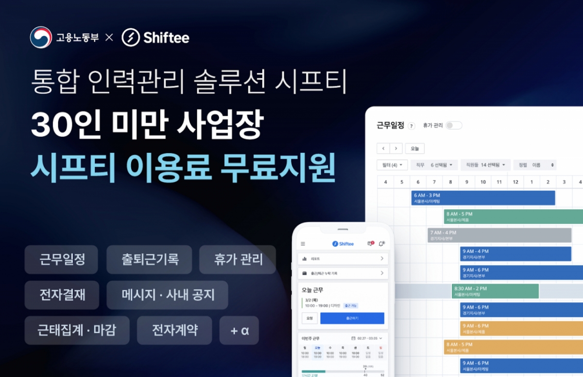 통합 HR(인력관리) 솔루션을 운영하는 시프티가 고용노동부 '영세사업장 인사 노무관리체계 구축지원 사업'의 공급기업으로 선정돼 30인 미만 기업을 대상으로 HR 솔루션의 무료 이용을 지원한다고 11일 밝혔다.