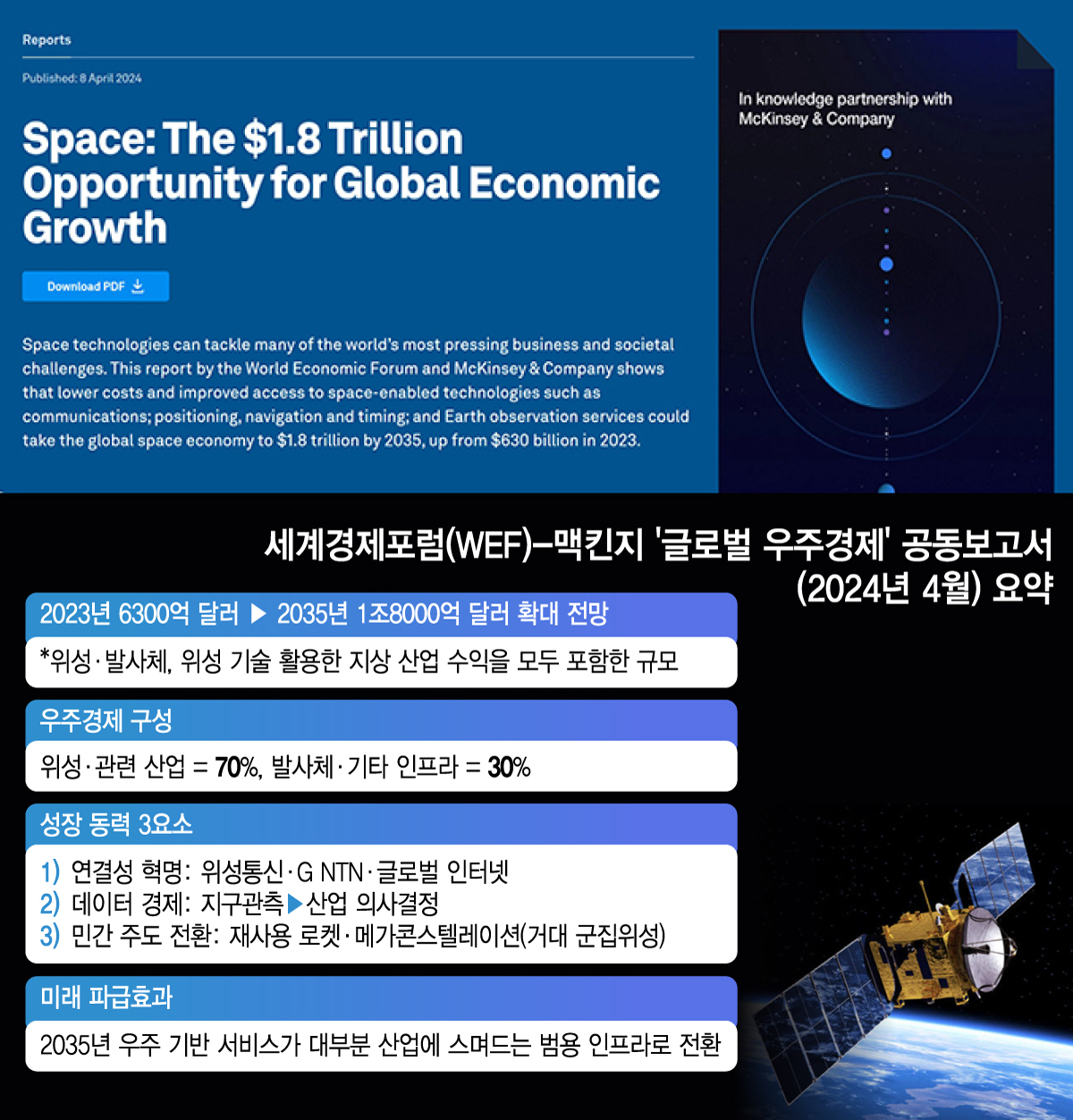 맥킨지와 세계경제포럼에 따르면 전 세계 우주산업 규모는 2023년 6300억달러(약 925조원)에서 연평균 약 9%씩 성장해 2035년에는 1조8000억달러(2643조원)로 커질 전망이다. 현재 규모만 보더라도 우주산업은 단일 산업 기준으로 이미 스마트폰(2024년 589조원)은 물론 반도체 산업(911조원)을 넘어섰다.