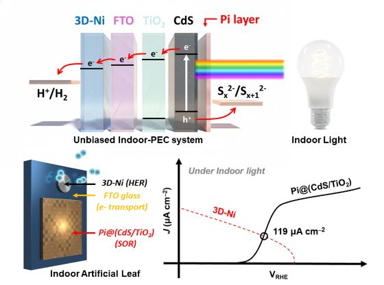 연구팀은 실내처럼 약한 빛도 잘 흡수하는 황화물(CdS)을 광전극 소재로 사용했다. 여기서 생성된 전하는 이산화티타늄(TiO₂) 층을 거쳐 뒤쪽의 수소 생산 촉매(3차원 니켈)로 이동하고, 그 표면에서 물과 반응해 수소가 발생한다.