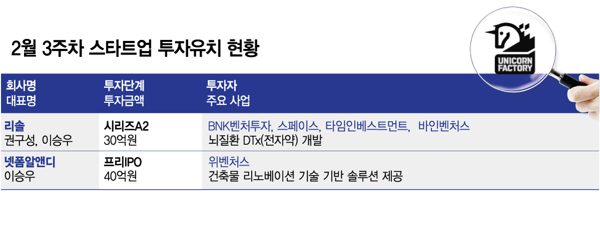 2월 셋째주(16~20일) 설 연휴 직후 투자유치를 발표한 곳은 멘탈 헬스케어 테크 스타트업 '리솔'과 건축물 리노베이션 기술 기반 솔루션 스타트업 '넷폼알앤디' 두곳이다. 특히 넷폼알앤디는 프리IPO(상장 전 투자유치) 투자를 유치하면서 본격적인 상장 준비에 들어갔다.
