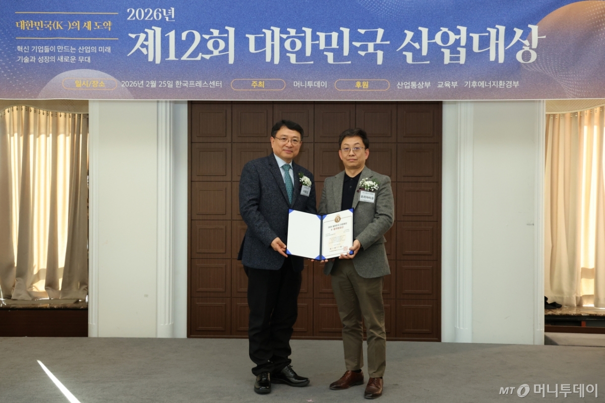 정원석 모리아타운 수석연구원(사진 오른쪽)이 25일 오후 서울 중구 한국프레스센터에서 열린 머니투데이 주최의 '2026 제12회 대한민국 산업대상' 시상식에서 5년 연속상으로 '일자리 중개 플랫폼' 부문 'K-플랫폼대상'을 수상하고 이종섭 동국대학교 교수와 기념사진을 촬영 중이다.