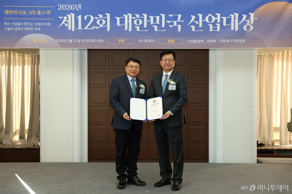 최거석 인포카 대표(사진 오른쪽)가 25일 오후 서울 중구 한국프레스센터에서 열린 머니투데이 주최의 '2026 제12회 대한민국 산업대상' 시상식에서 5년 연속상으로 '스마트 차량 데이터 플랫폼' 부문 'K-기술대상'을 수상하고 이종섭 동국대학교 교수와 기념사진을 촬영 중이다.